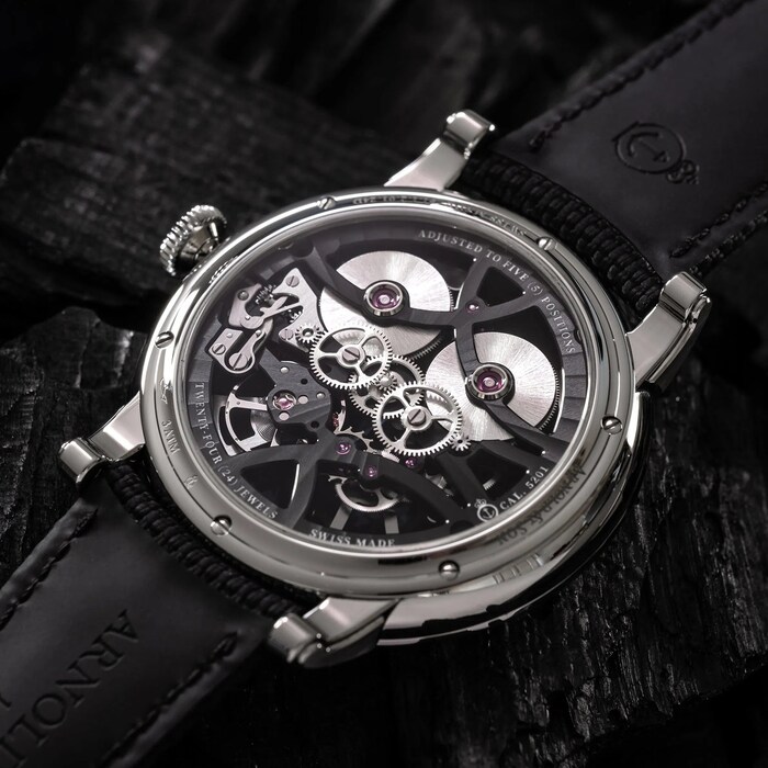 Like all the movements used by Arnold & Son, the A&S5201 calibre has been entirely developed, manufactured, decorated, assembled, adjusted and cased-up at the Manufacture in La Chaux-de-Fonds. This calibre draws on a pair of large barrels and an oscillating frequency of 3 Hz, which delivers a 90-hour power reserve. In addition, its depth of 4.18 mm is exceptional for a skeletonised movement, as these types of calibres usually retain a certain thickness in order to compensate for their openworked designs, which typically weaken their structures. Despite this, Arnold & Son’s long Manufacture experience has made it possible to imbue the Nebula’s mechanical latticework with extraordinary finesse.